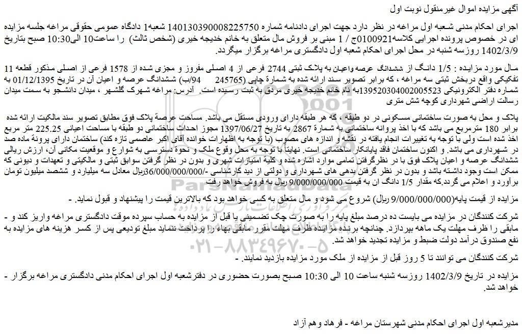 مال مورد مزایده : 1/5 دانگ از ششدانگ عرصه واعیان به پلاک ثبتی 2744 فرعی از 4 اصلی مفروز و مجزی شده از 1578 فرعی از اصلی مذکور قطعه 11 تفکیکی واقع دربخش ثبتی سه مراغه ، که برابر تصویر سند ارائه شده به شمارة چاپی (245765 94/ب) ششدانگ عرصه و اعیان آن در تاریخ 01/12/1395 به شماره دفتر الکترونیکی 139520304002005523به نام خانم خدیجه خیری مردق به ثبت رسیده است. آدرس: مراغه شهرک گلشهر ، میدان دانشجو به سمت میدان رسالت اراضی شهرداری کوچه شش متری