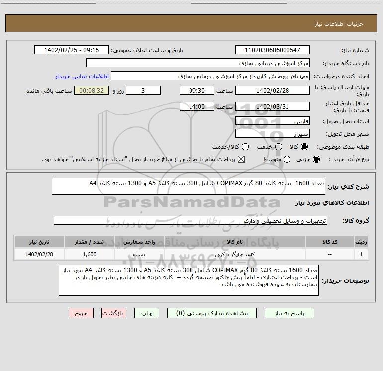 توضیحات خریدار:تعداد 1600 بسته کاغذ 80 گرم COPIMAX شامل 300 بسته کاغذ A5 و 1300 بسته کاغذ A4 مورد نیاز است - پرداخت اعتباری - لطفاً پیش فاکتور ضمیمه گردد – کلیه هزینه های جانبی نظیر تحویل بار در بیمارستان به عهده فروشنده می باشد