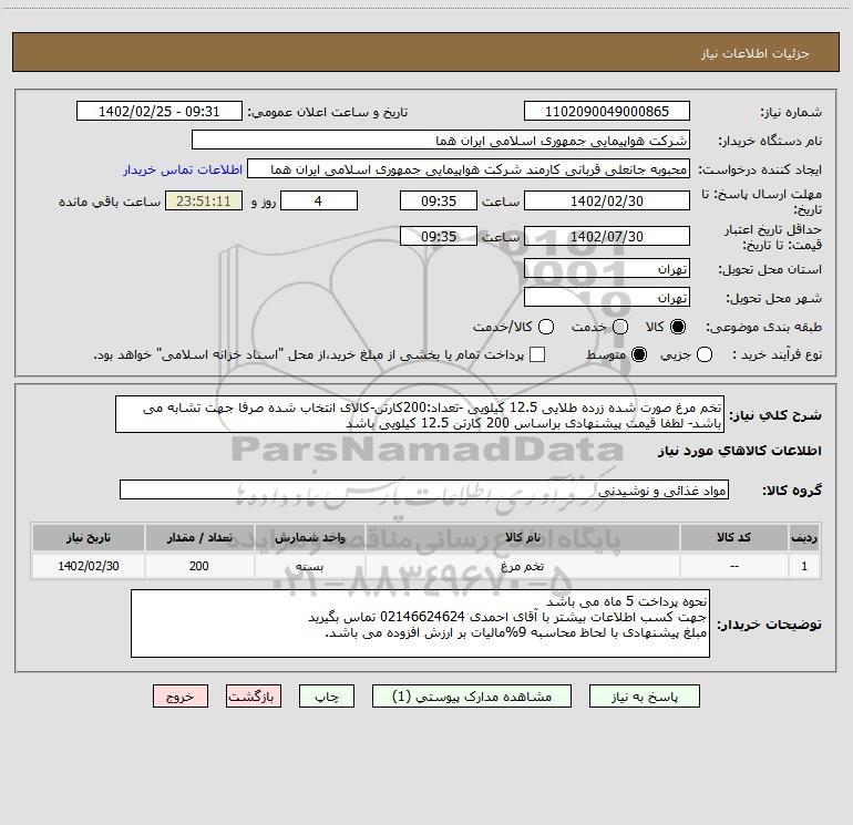 شرح کلی نیاز: تخم مرغ صورت شده زرده طلایی 12.5 کیلویی -تعداد:200کارتن-کالای انتخاب شده صرفا جهت تشابه می باشد- لطفا قیمت پیشنهادی براساس 200 کارتن 12.5 کیلویی باشد
