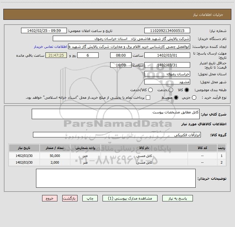 | 1 | -- | کابل مسی | متر | 50,000 | 1402/03/30 |