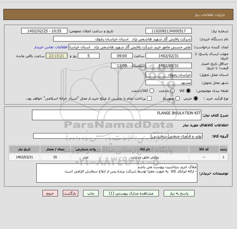 شرح کلی نیاز: FLANGE INSULATION KIT