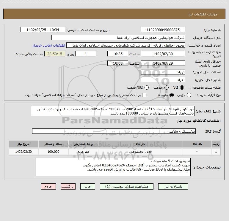 نام دستگاه خریدار:شرکت هواپیمایی جمهوری اسلامی ایران هما