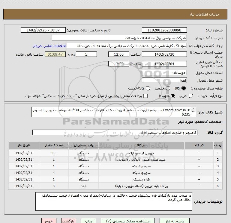 شرح کلی نیاز: Exsom envr3416 - سوئیچ 8پورت - سوئیچ 4 پورت - هارد 4ترابایت - باکس 30*40 بیرونی - دوربین اکسوم b235