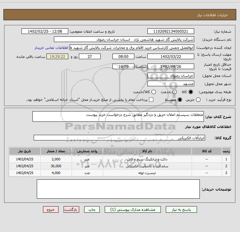نام دستگاه خریدار:شرکت پالایش گاز شهید هاشمی نژاد استان خراسان رضوی