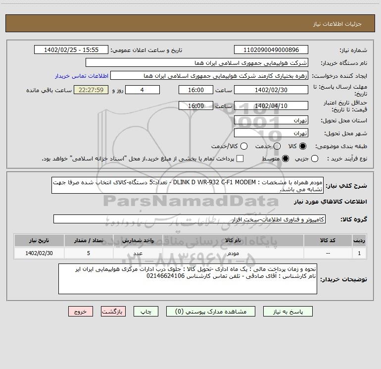 شرح کلی نیاز: مودم همراه با مشخصات : DLINK D WR-932 C-F1 MODEM - تعداد:5 دستگاه-کالای انتخاب شده صرفا جهت تشابه می باشد.