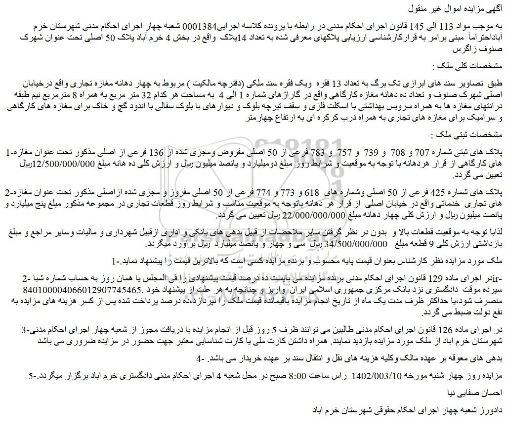 به موجب مواد 113 الی 145 قانون اجرای احکام مدنی در رابطه با پرونده کلاسه اجرایی0001384 شعبه چهار اجرای احکام مدنی شهرستان خرم آباداحترامآ مبنی برامر به قرارکارشناسی ارزیابی پلاکهای معرفی شده به تعداد 14پلاک واقع در بخش 4 خرم آباد پلاک 50 اصلی تحت عنوان شهرک صنوف زاگرس
