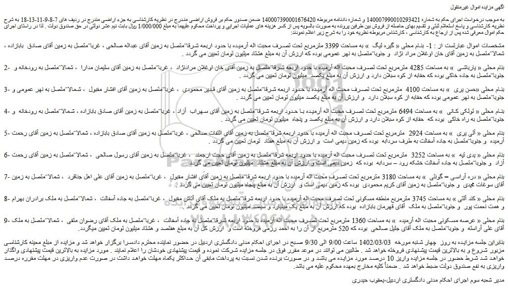 به موجب درخواست اجرای حکم به شماره 140007990010293421 و شماره دادنامه مربوطه 140007390001676420 ضمن صدور حکم بر فروش اراضی مندرج در نظریه کارشناسی به جزء اراضی مندرج در ردیف های 7-8-9-11-13-18 به شرح نظریه کارشناسی و پاسخ استعلام ثبتی و تقسیم بهای حاصله از فروش بین طرفین پرونده به صورت بالسویه پس از کسر هزینه های عملیات اجرایی و پرداخت محکوم علیهما به مبلغ 1/000/000 ریال بابت نیم عشر دولتی در حق صندوق دولت . لذا در راستای اجرای حکم اموال معرفی شده پس از ارجاع به کارشناسی ، کارشناس مربوطه نظریه خود را به شرح زیر اعلام نمودند: