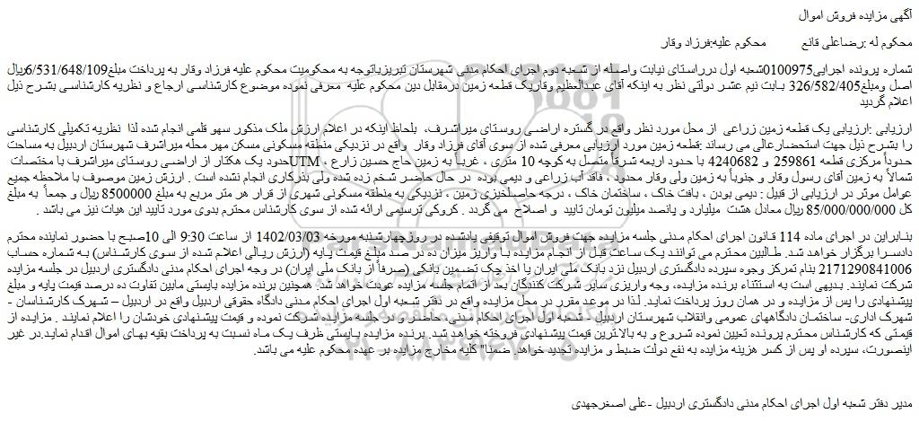 شماره پرونده اجرایی0100975شعبه اول درراستای نیابت واصله از شعبه دوم اجرای احکام مدنی شهرستان تبریزباتوجه به محکومیت محکوم علیه فرزاد وقار به پرداخت مبلغ6/531/648/109ریال اصل ومبلغ326/582/405 بابت نیم عشر دولتی نظر به اینکه آقای عبدالعظیم وقاریک قطعه زمین درمقابل دین محکوم علیه معرفی نموده موضوع کارشناسی ارجاع و نظریه کارشناسی بشرح ذیل اعلام گردید