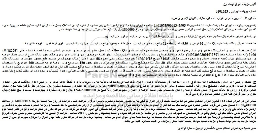 مشخصات اموال : ملک به شماره پلاک ثبتی 92 فرعی از 4839 اصلی قطعه 92 واقع در بخش دو اردبیل، محل ملک موصوف واقع در اردبیل- چهارراه ژاندارمری - کوی فرهنگیان – کوچه دانش یک