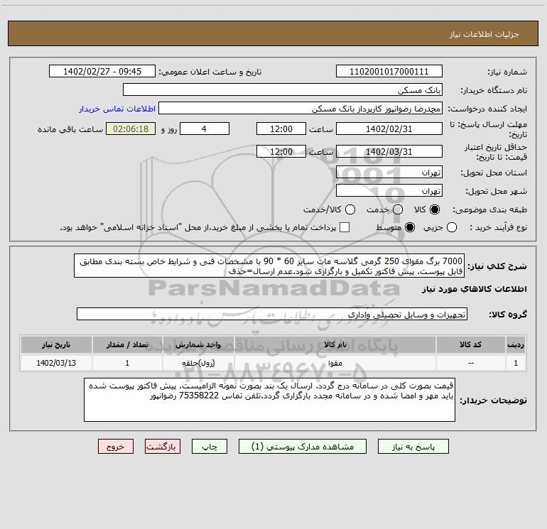شرح کلی نیاز: 7000 برگ مقوای 250 گرمی گلاسه مات سایز 60 * 90 با مشخصات فنی و شرایط خاص بسته بندی مطابق فایل پیوست. پیش فاکتور تکمیل و بارگزاری شود.عدم ارسال=حذف