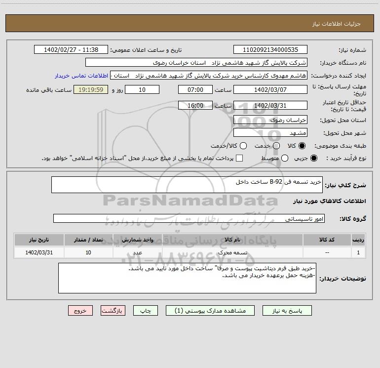 نام دستگاه خریدار:شرکت پالایش گاز شهید هاشمی نژاد استان خراسان رضوی
