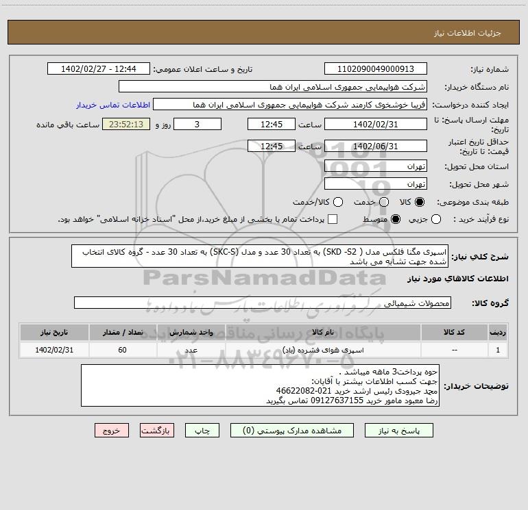 شرح کلی نیاز: اسپری مگنا فلکس مدل ( SKD -S2) به تعداد 30 عدد و مدل (SKC-S) به تعداد 30 عدد - گروه کالای انتخاب شده جهت تشابه می باشد