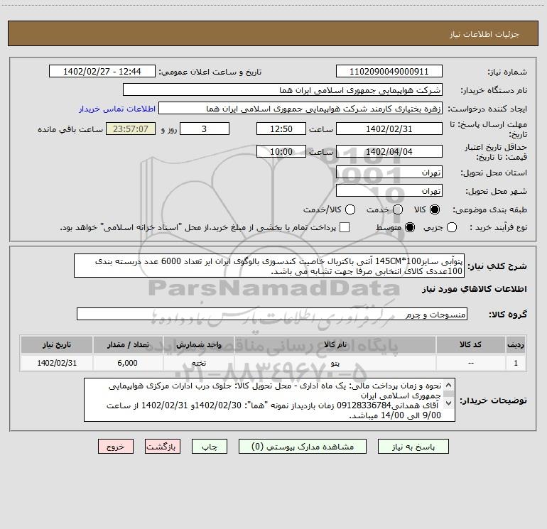شرح کلی نیاز: پتوآبی سایز100*145CM آنتی باکتریال خاصیت کندسوزی بالوگوی ایران ایر تعداد 6000 عدد دربسته بندی 100عددی کالای انتخابی صرفا جهت تشابه می باشد.