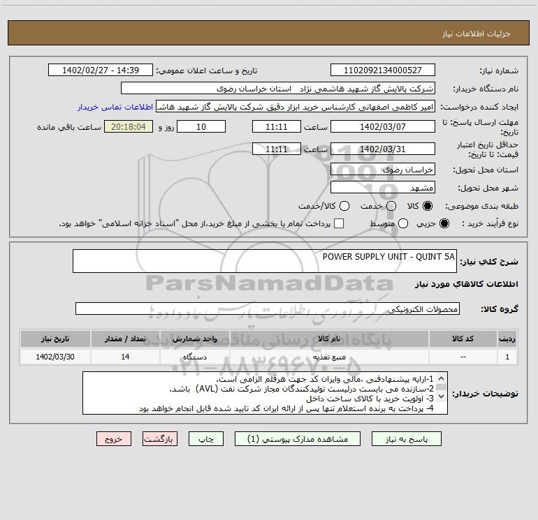 استعلام POWER SUPPLY UNIT - QUINT 5A, استعلام POWER SUPPLY UNIT - QUINT 5A