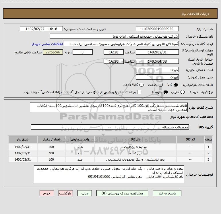 شرح کلی نیاز: اقلام شستشو شامل(آب ژاول100 گالن،مایع نرم کننده100گالن،پودر ماشین لباسشویی100بسته)،کالای انتخابی جهت تشابه است.