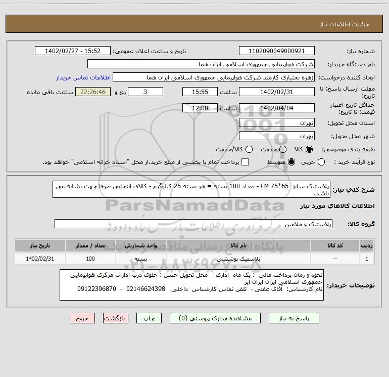 شرح کلی نیاز: پلاستیک سایز 65*75 CM - تعداد 100 بسته = هر بسته 25 کیلوگرم - کالای انتخابی صرفا جهت تشابه می باشد.