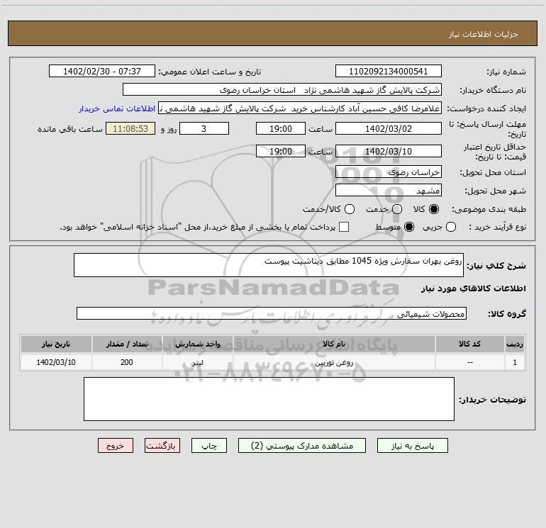 شرح کلی نیاز: روغن بهران سفارش ویژه 1045 مطابق دیتاشیت پیوست