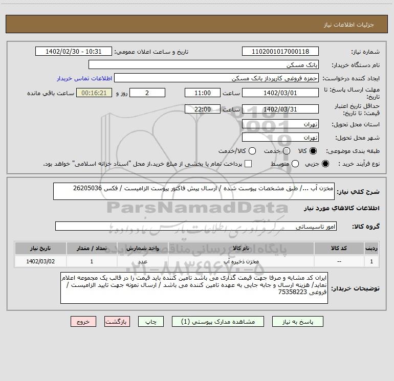 شرح کلی نیاز: مخزن آب .../ طبق مشخصات پیوست شده / ارسال پیش فاکتور پیوست الزامیست / فکس 26205036