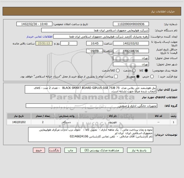 شرح کلی نیاز: پنل هوشمند جی پلاس مدل BLACK SMART BOARD GIPLUS GSB 75JB 75 - تعداد 2 عدد - کالای انتخاب شده صرفا جهت تشابه است.