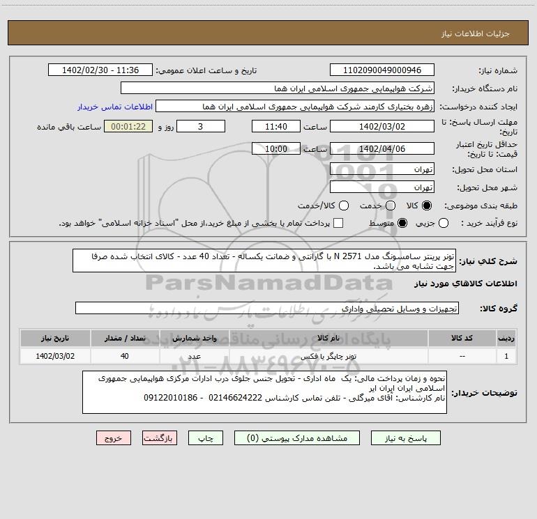 شرح کلی نیاز: تونر پرینتر سامسونگ مدل 2571 N با گارانتی و ضمانت یکساله - تعداد 40 عدد - کالای انتخاب شده صرفا جهت تشابه می باشد.