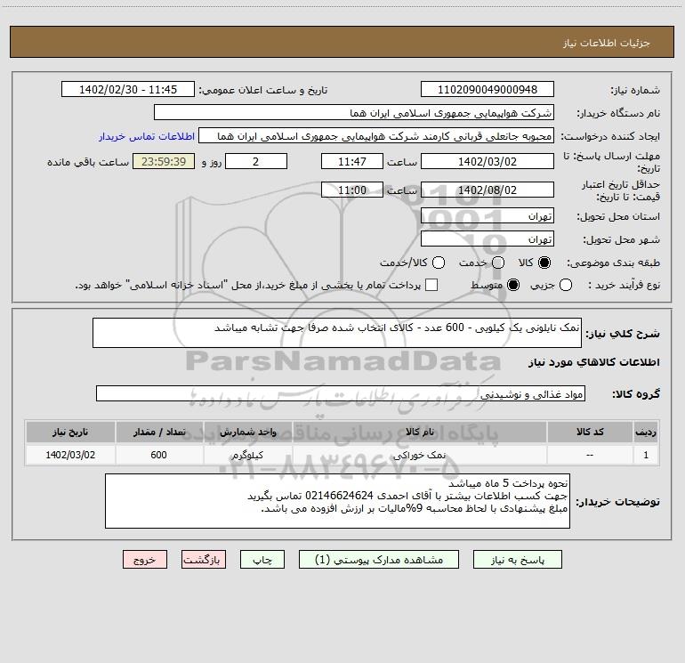 | 1 | -- | نمک خوراکی | کیلوگرم | 600 | 1402/03/02 |