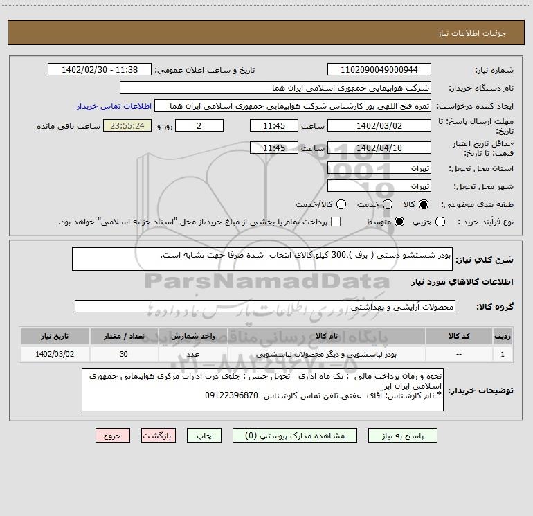 شرح کلی نیاز: پودر شستشو دستی ( برف )،300 کیلو،کالای انتخاب شده صرفا جهت تشابه است.