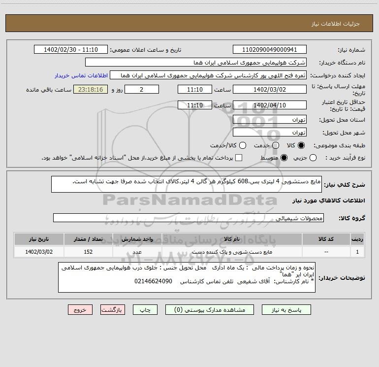 شرح کلی نیاز: مایع دستشویی 4 لیتری بس،608 کیلوگرم هر گالن 4 لیتر،کالای انتخاب شده صرفا جهت تشابه است.