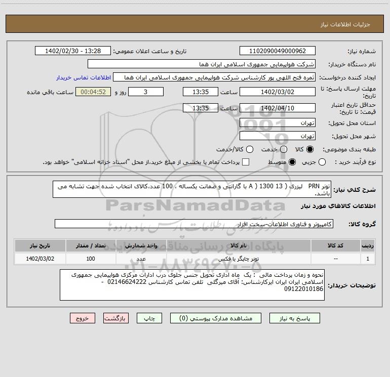 شرح کلی نیاز: تونر PRN لیزری ( 13 A ) 1300 با گارانتی و ضمانت یکساله ، 100 عدد،کالای انتخاب شده جهت تشابه می باشد.