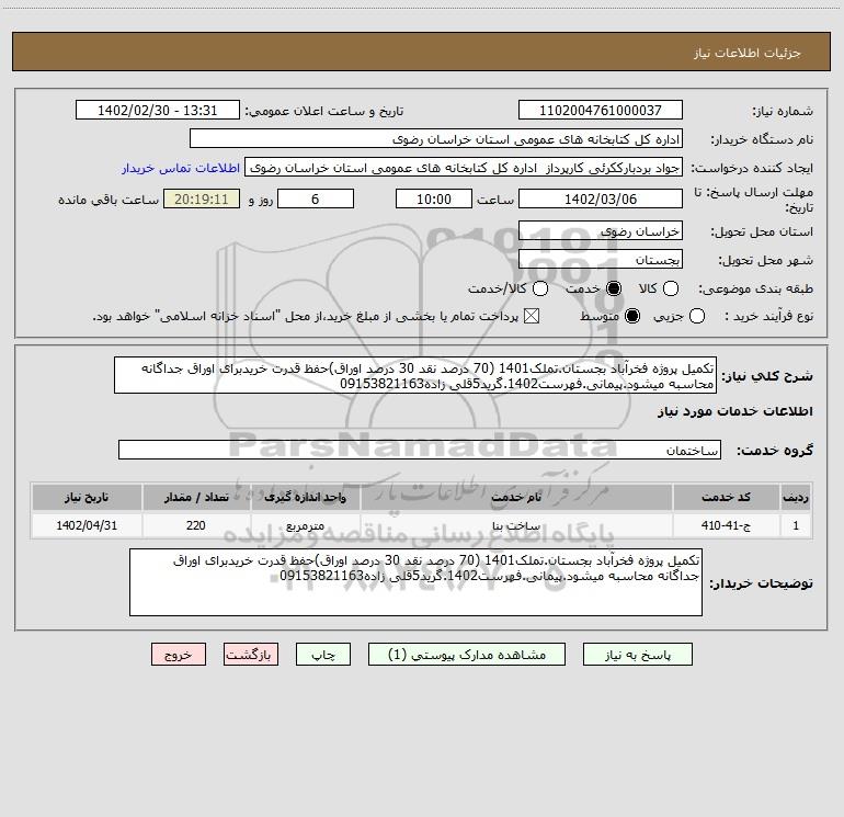 شرح کلی نیاز: تکمیل پروژه فخرآباد بجستان.تملک1401 (70 درصد نقد 30 درصد اوراق)حفظ قدرت خریدبرای اوراق جداگانه محاسبه میشود.پیمانی.فهرست1402.گرید5قلی زاده09153821163