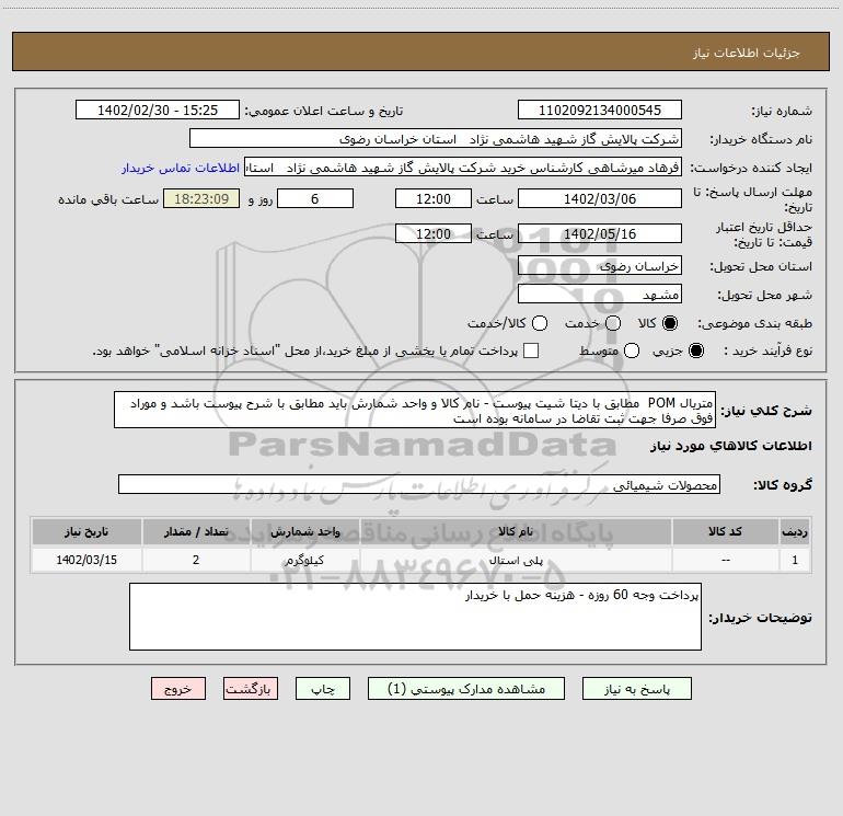 شرح کلی نیاز: متریال POM مطابق با دیتا شیت پیوست - نام کالا و واحد شمارش باید مطابق با شرح پیوست باشد و موراد فوق صرفا جهت ثبت تقاضا در سامانه بوده است