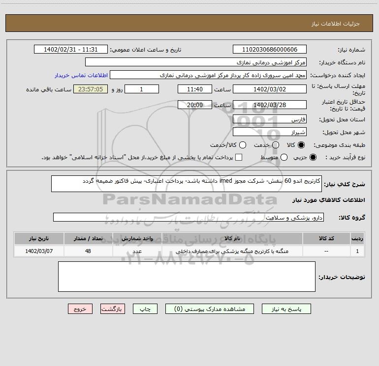 شرح کلی نیاز: کارتریج اندو 60 بنفش- شرکت مجوز imed داشته باشد- پرداخت اعتباری- پیش فاکتور ضمیمه گردد