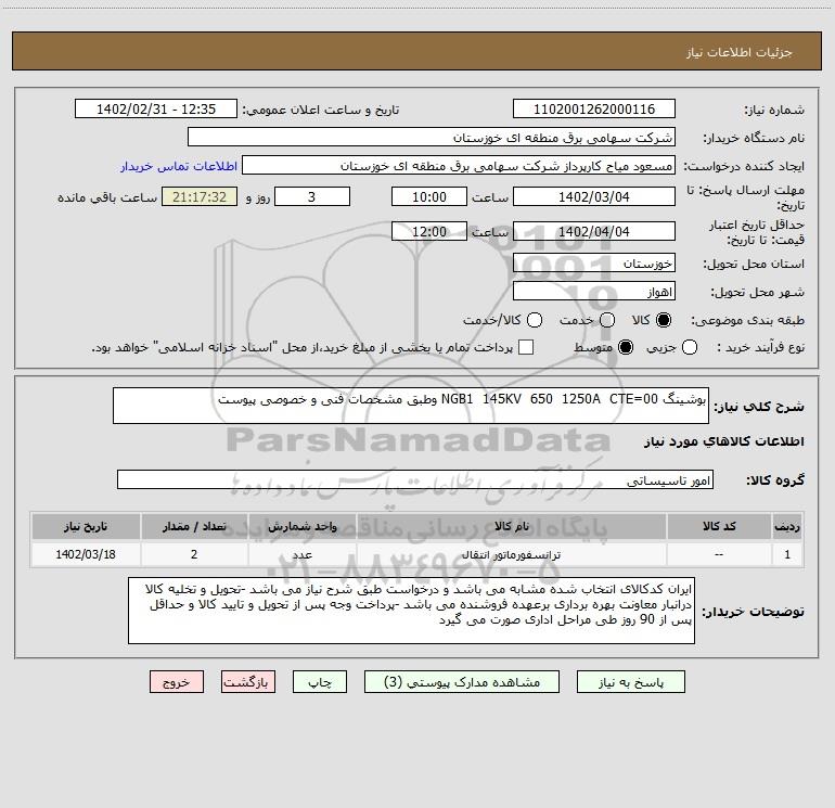 شرح کلی نیاز: بوشینگ NGB1 145KV 650 1250A CTE=00 وطبق مشخصات فنی و خصوصی پیوست