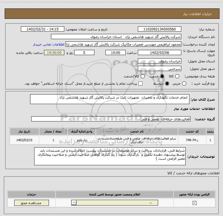نام دستگاه خریدار:شرکت پالایش گاز شهید هاشمی نژاد استان خراسان رضوی