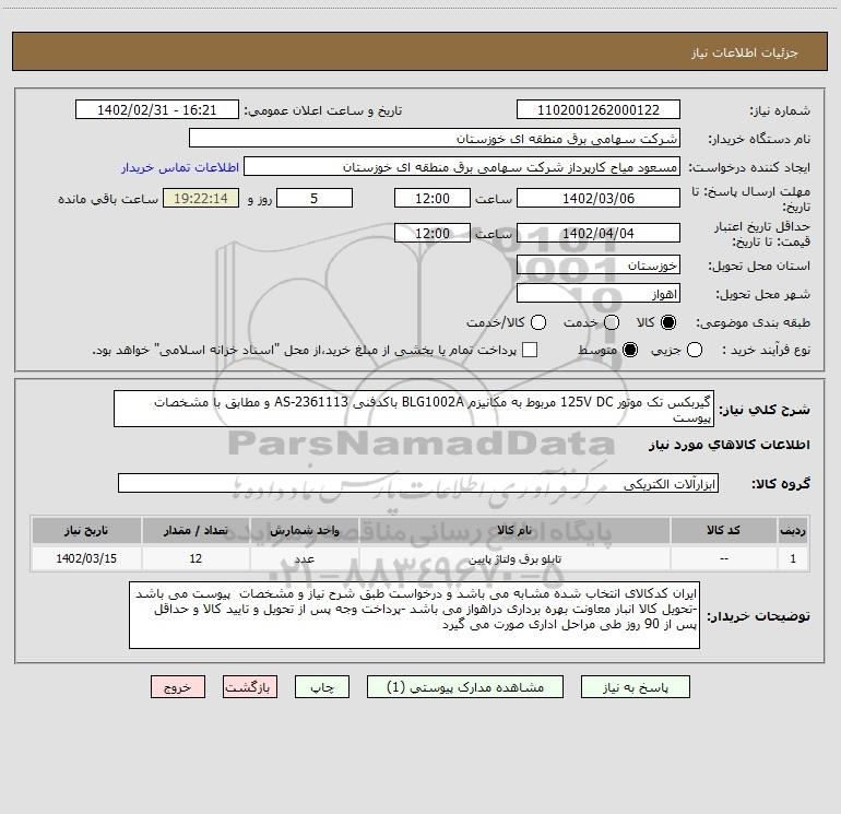شرح کلی نیاز: گیربکس تک موتور 125V DC مربوط به مکانیزم BLG1002A باکدفنی AS-2361113 و مطابق با مشخصات پیوست