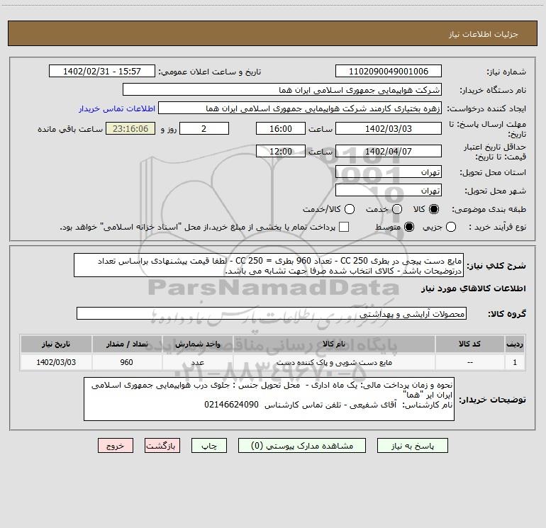 شرح کلی نیاز: مایع دست پیچی در بطری 250 CC - تعداد 960 بطری = 250 CC - لطفا قیمت پیشنهادی براساس تعداد درتوضیحات باشد - کالای انتخاب شده صرفا جهت تشابه می باشد.