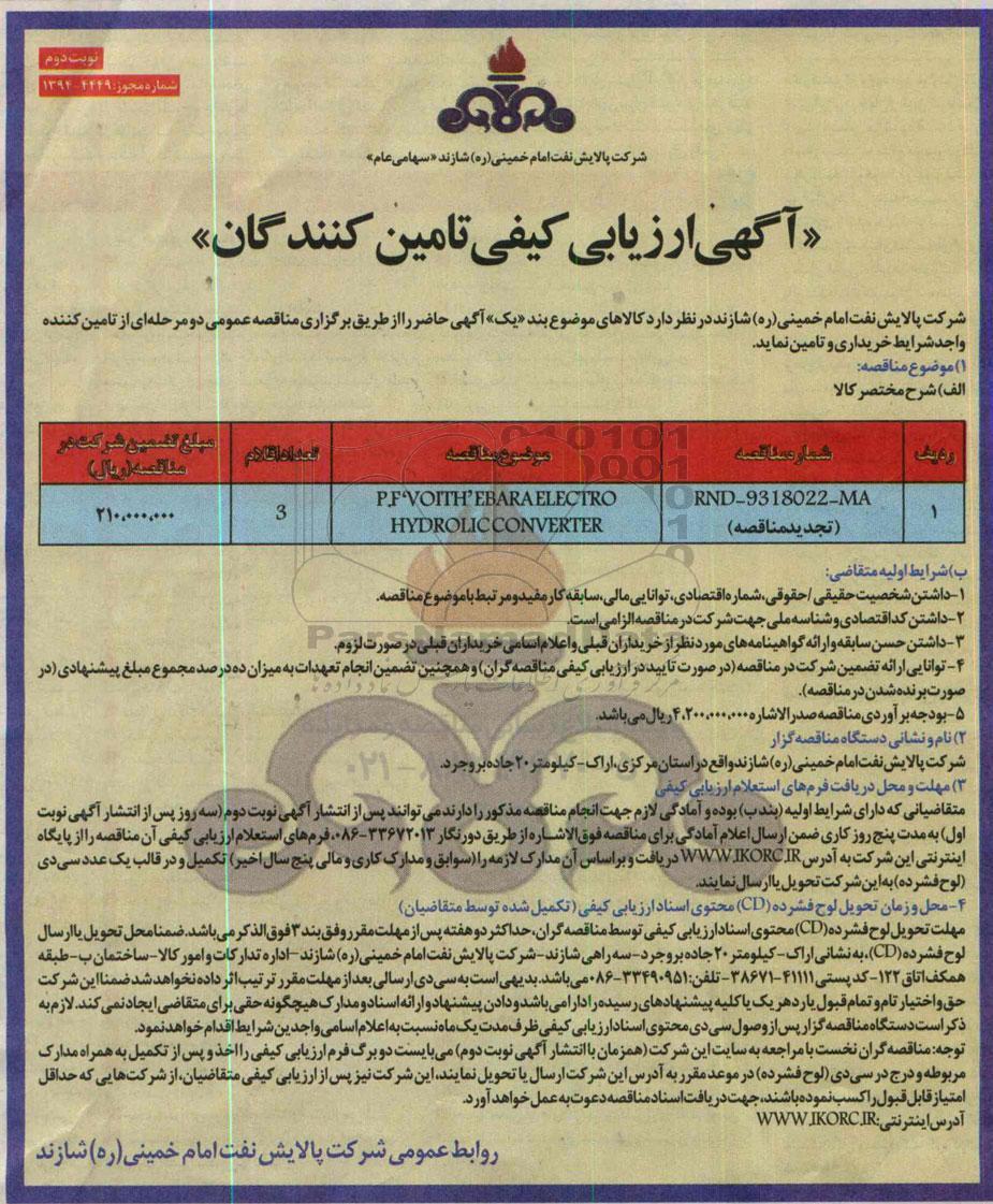 مناقصه P.F. VOITH EBARA ELECTRO-HVDROLHC CONVERTER تجدید- نوبت دوم از کلیه افراد متخصص و شرکتها واجد شرایط دعوت به عمل میآید در مناقصه با کد خبرگزاری پارس نماد: 585126 شرکت نمایند.