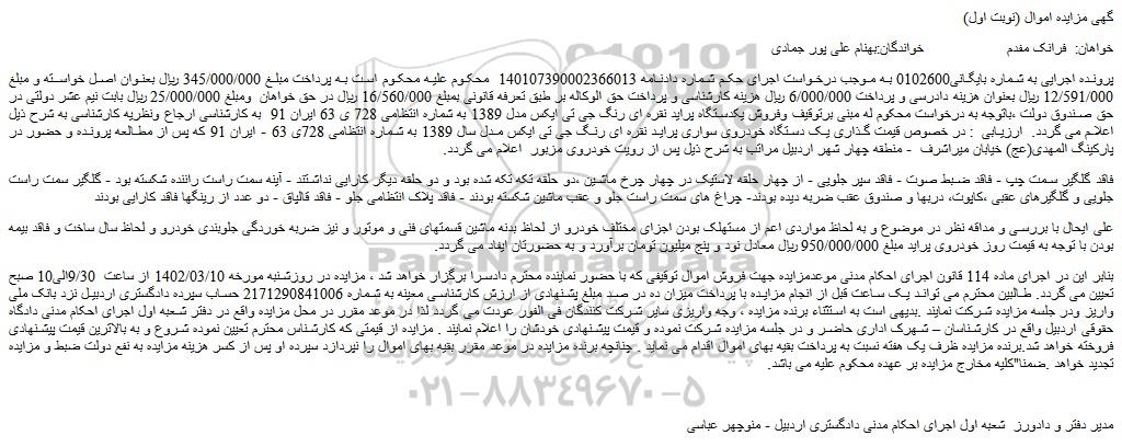 بنابر این در اجرای ماده 114 قانون اجرای احکام مدنی موعدمزایده جهت فروش اموال توقیفی که با حضور نماینده محترم دادسرا برگزار خواهد شد ، مزایده در روزشنبه مورخه 1402/03/10 از ساعت 9/30الی10 صبح تعیین می گردد. طالبین محترم می تواند یک ساعت قبل از انجام مزایده با پرداخت میزان ده در صد مبلغ پشنهادی از ارزش کارشناسی معینه به شماره 2171290841006 حساب سپرده دادگستری اردبیل نزد بانک ملی واریز ودر جلسه مزایده شرکت نمایند .بدیهی است به استثناء برنده مزایده ، وجه واریزی سایر شرکت کنندگان فی الفور عودت می گردد لذا در موعد مقرر در محل مزایده واقع در دفتر شعبه اول اجرای احکام مدنی دادگاه حقوقی اردبیل واقع در کارشناسان – شهرک اداری حاضر و در جلسه مزایده شرکت نموده و قیمت پیشنهادی خودشان را اعلام نمایند . مزایده از قیمتی که کارشناس محترم تعیین نموده شروع و به بالاترین قیمت پیشنهادی فروخته خواهد شد.برنده مزایده ظرف یک هفته نسبت به پرداخت بقیه بهای اموال اقدام می نماید . چنانچه برنده مزایده در موعد مقرر بقیه بهای اموال را نپردازد سپرده او پس از کسر هزینه مزایده به نفع دولت ضبط و مزایده تجدید خواهد .ضمنا"کلیه مخارج مزایده بر عهده محکوم علیه می باشد.