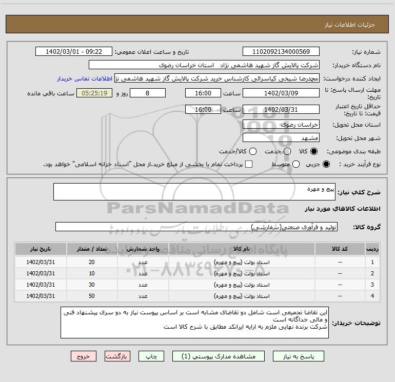 نام دستگاه خریدار:شرکت پالایش گاز شهید هاشمی نژاد استان خراسان رضوی