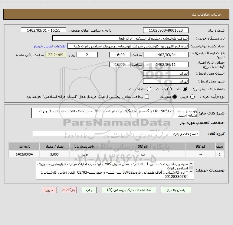 شرح کلی نیاز: پتو سبز سایز 120*150 CM رنگ سبز با لوگوی ایران ایر،تعداد3000 عدد ،کالای انتخاب شده صرفا جهت تشابه است.