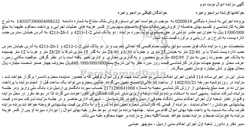 پرونده اجرایی به شماره بایگانی 0200019 به موجب درخواست اجرای دستورفروش ملک مشاع به شماره دادنامه 140107390004098332 به شرح نظریه کارشناسی و تقسیم بهای حاصله از فروش بین مالک مشاع به نسبت سهم پس از کسر هزینه های عملیات اجرایی و پرداخت محکوم علیهما به مبلغ 1/000/000 ریال به عنوان نیم عشر دولتی در حق صندوق دولت.مورد مزایده : دو پلاک ثبتی 2-1-4213 و 1-26-4213 به آدرس خیابان مدرس جنب اداره پست، به شرح زیر ارزیابی و برآورد قیمت شده است.