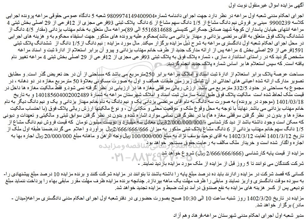اجرای احکام مدنی شعبه اول مراغه در نظر دارد جهت اجرای دادنامه شماره9809974149400904 شعبه 5 دادگاه عمومی حقوقی مراغه پرونده اجرایی کلاسه 9900239 مبنی بر فروش نیم دانگ مشاع از 1/5 دانگ سهم مشاع از 6 دانگ پلاک ثبتی 93فرعی مجزی از 12فرعی از 29 اصلی بخش ثبتی 4 مراغه انتهای خیابان پاسداران کوچة شهید صادق جمکرانی کدپستی 5516814688 الی 89)مراغه مال متعلق به خانم مهتاب یزدانی (مقدار 4/5 دانگ از ششدانگ پلاک فوق متعلق به اقای مرتضی یزدانی و مهناز یزدانی می باشد)محکوم علیه پرونده های مذکور جهت استیفاء محکوم به و هزینه های اجرایی در محل اجرای احکام شعبه اول دادگستری مراغه به شرح ذیل مزایده برگزار میکند. مال مورد مزایده : نیم دانگ از1/5 دانگ از ششدانگ پلاک ثبتی 1591فرعی از 29 اصلی بخش 4 مراغه پس از ارائه مدارک جدید از طرف خانم مهتاب یزدانی و پیرو آن برابر استعلام از ادارة ثبت و اسناد مراغه مشخص گردید که در راستای استاندارد سازی ، شماره پلاک فوق به پلاک ثبتی 93فرعی مجزی از 12فرعی از 29 اصلی بخش ثبتی 4 مراغه تغییر نام یافته است. که سپس استعلام ها بر اساس شماره پلاک جدید انجام گردید.