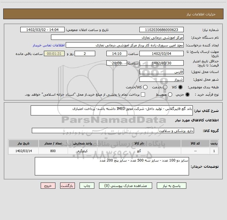 شرح کلی نیاز: باند گچ فایبرگلاس - تولید داخل- شرکت مجوز IMED داشته باشد- پرداخت اعتباری
