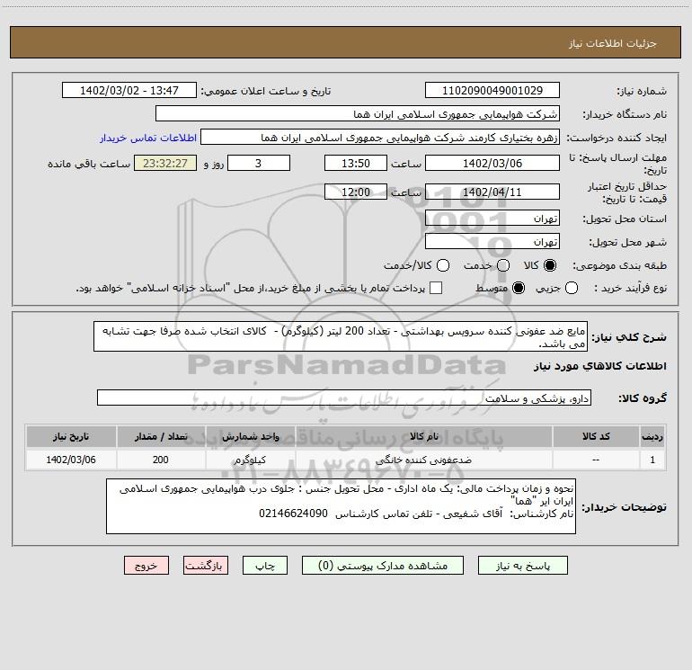 شرح کلی نیاز: مایع ضد عفونی کننده سرویس بهداشتی - تعداد 200 لیتر (کیلوگرم) - کالای انتخاب شده صرفا جهت تشابه می باشد.