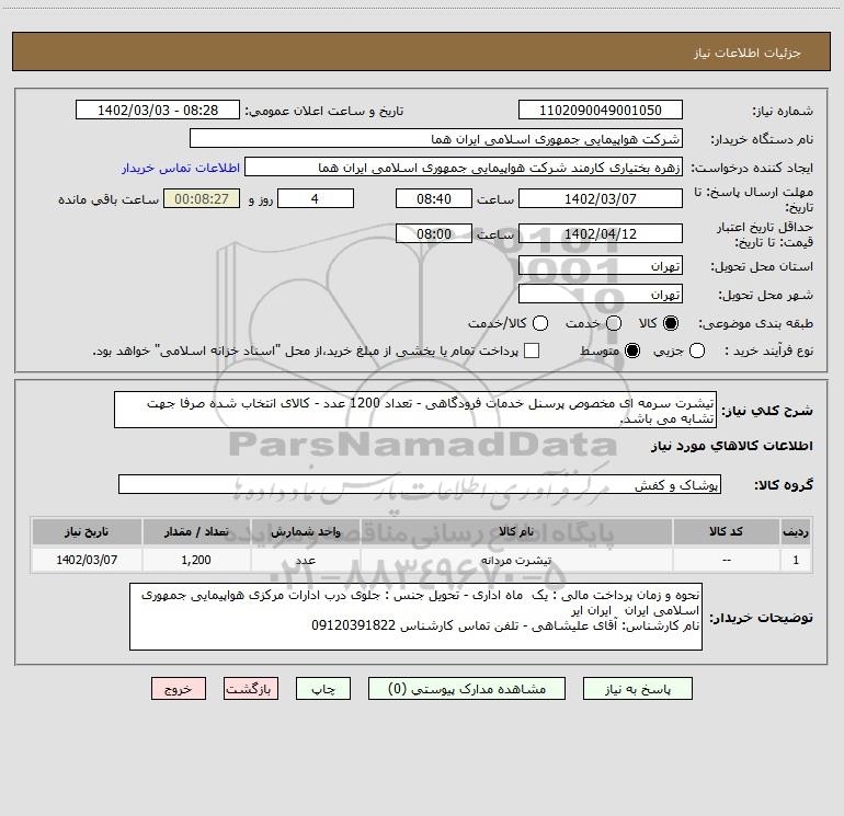 شرح کلی نیاز: تیشرت سرمه ای مخصوص پرسنل خدمات فرودگاهی - تعداد 1200 عدد - کالای انتخاب شده صرفا جهت تشابه می باشد.