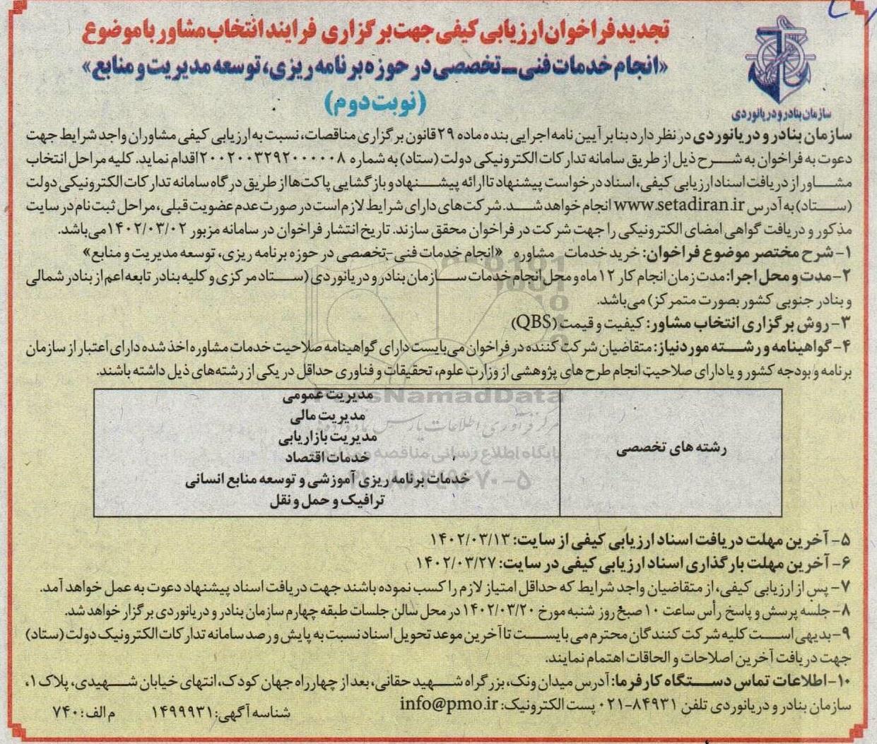 سازمان بنادر و دریانوردی در نظر دارد بنا بر آیین نامه اجرایی بنده ماده ۲۹ قانون برگزاری مناقصات نسبت به ارزیابی کیفی مشاوران واجد شرایط جهت دعوت به فراخوان به شرح ذیل از طریق سامانه تدارکات الکترونیکی دولت (ستاد) به شماره 2002003292000008 اقدام نماید. کلیه مراحل انتخاب مشاور از دریافت اسناد ارزیابی کیفی اسناد درخواست پیشنهاد تا ارائه پیشنهاد و بازگشایی پاکتها از طریق درگاه سامانه تدارکات الکترونیکی دولت (ستاد به آدرس ستاد ایران انجام خواهد شد شرکتهای دارای شرایط لازم است در صورت عدم عضویت قبلی مراحل ثبت نام در سایت مذکور و دریافت گواهی امضای الکترونیکی را جهت شرکت در فراخوان محقق سازند تاریخ انتشار فراخوان در سامانه مزبور 1402.3.2 میباشد.