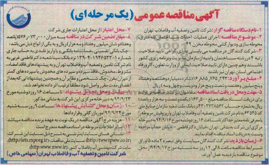 5-مهلت و محل دریافت اسناد مناقصه : متقاضیان شرکت در مناقصه می توانند برای دریافت اسناد مناقصه مبلغ 163.500 یکصد و شصت و سه هزار و پانصد ریال به شماره حساب 4303738562 نزد بانک ملت شعبه سازمان صنایع ملی کد 63545 به نام شرکت تامین و تصفیه آب و فاضلاب تهران واریز و فیش مربوطه را با معرفی نامه معتبر حداکثر تا ساعت 16 روز دوشنبه مورخ 94.9.16به دبیرخانه مرکزی این شرکت به نشانی تهران ـ خیابان دکتر فاطمی ـ خیابان حجاب مراجعه و نسبت به دریافت اسناد مناقصه اقدام نمایند .