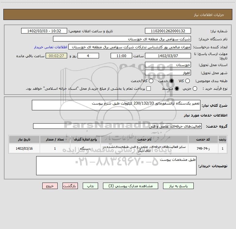 شرح کلی نیاز: تعمیر یکدستگاه ترانسفورماتور 230/132/33 کیلوولت طبق شرح پیوست