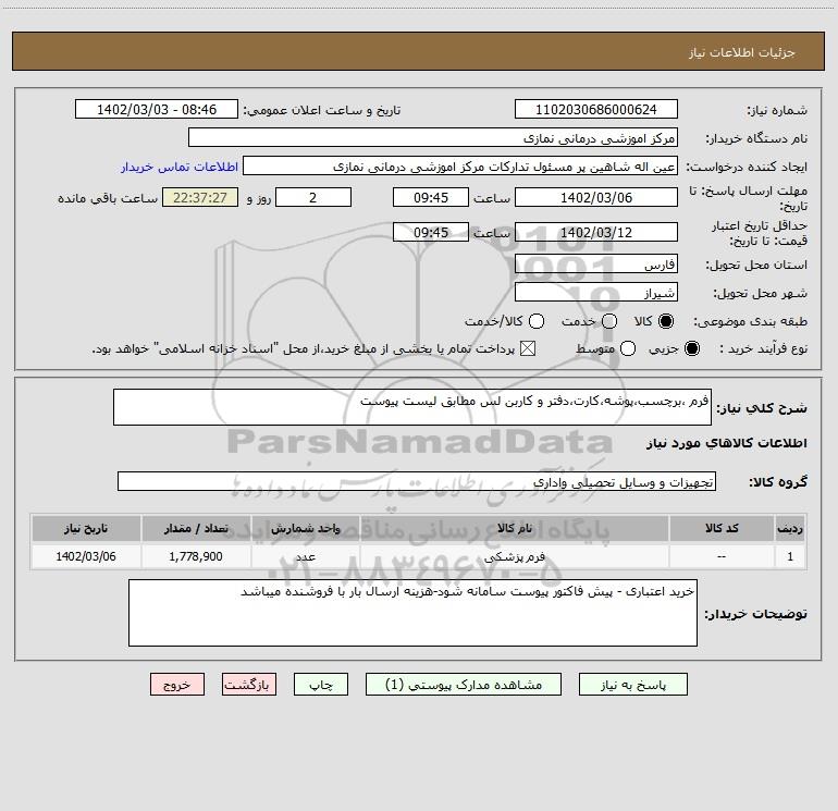 شرح کلی نیاز: فرم ،برچسب،پوشه،کارت،دفتر و کاربن لس مطابق لیست پیوست