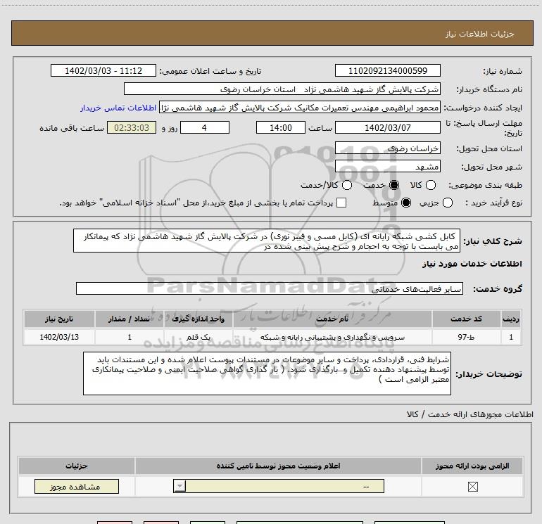 شرح کلی نیاز: کابل کشی شبکه رایانه ای (کابل مسی و فیبر نوری) در شرکت پالایش گاز شهید هاشمی نژاد که پیمانکار می بایست با توجه به احجام و شرح پیش بینی شده در
