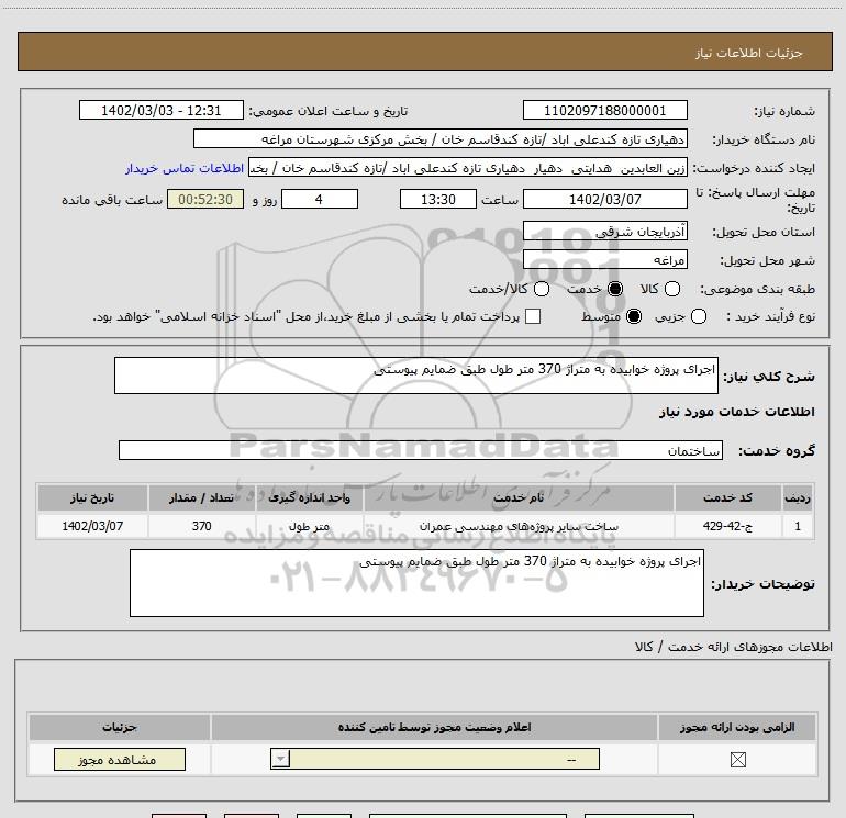 شرح کلی نیاز: اجرای پروژه خوابیده به متراژ 370 متر طول طبق ضمایم پیوستی